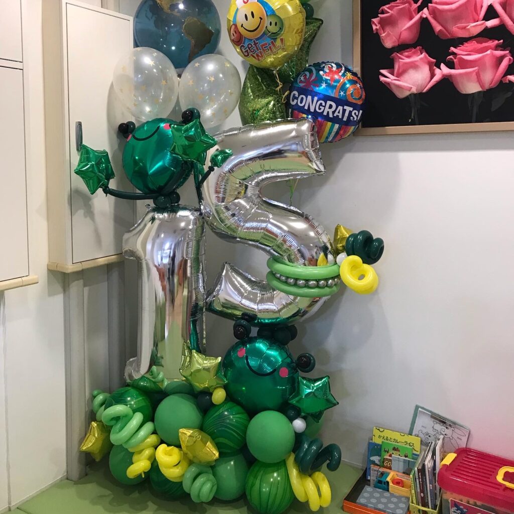 15周年記念という事で15という数字を真ん中に置いて、そのクリニックのキャラクターのかえるちゃんも作って見ました。