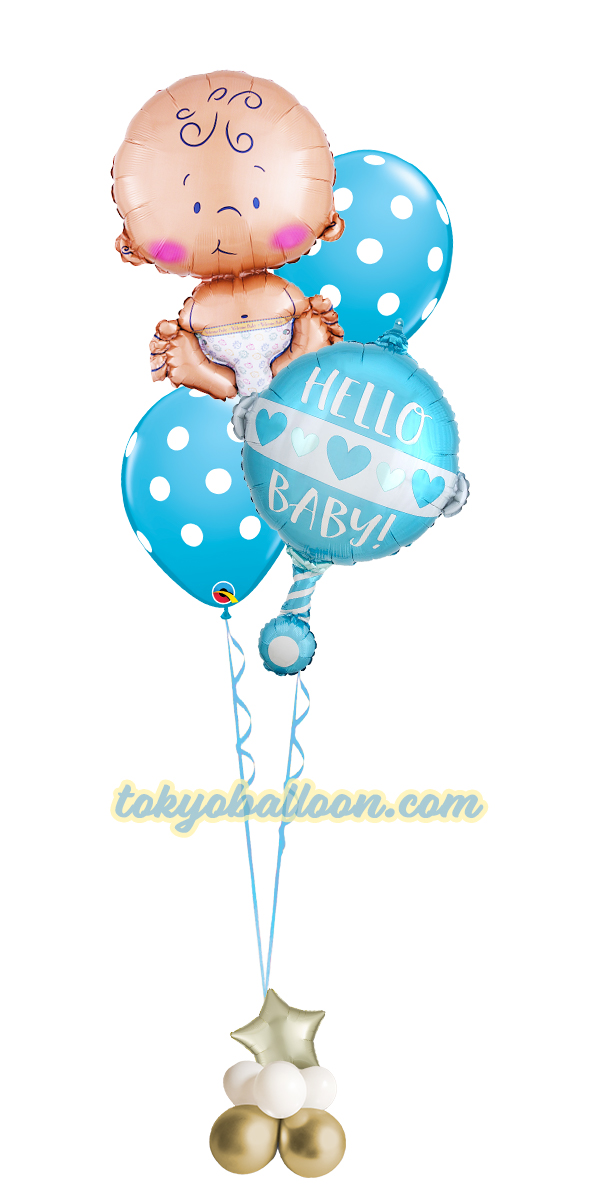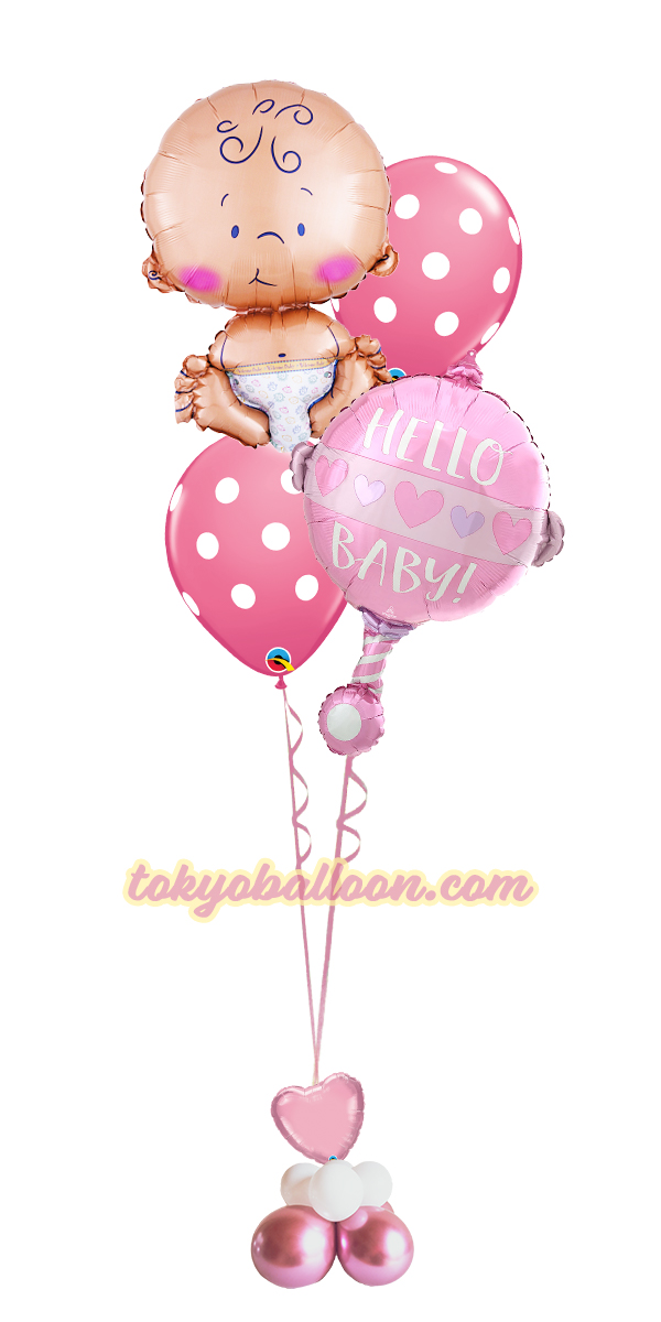 出産祝い用ヘリウム風船ギフト。女の子用と男の子用を選択できます。赤ちゃんとガラガラ風船がとってもキュートです。