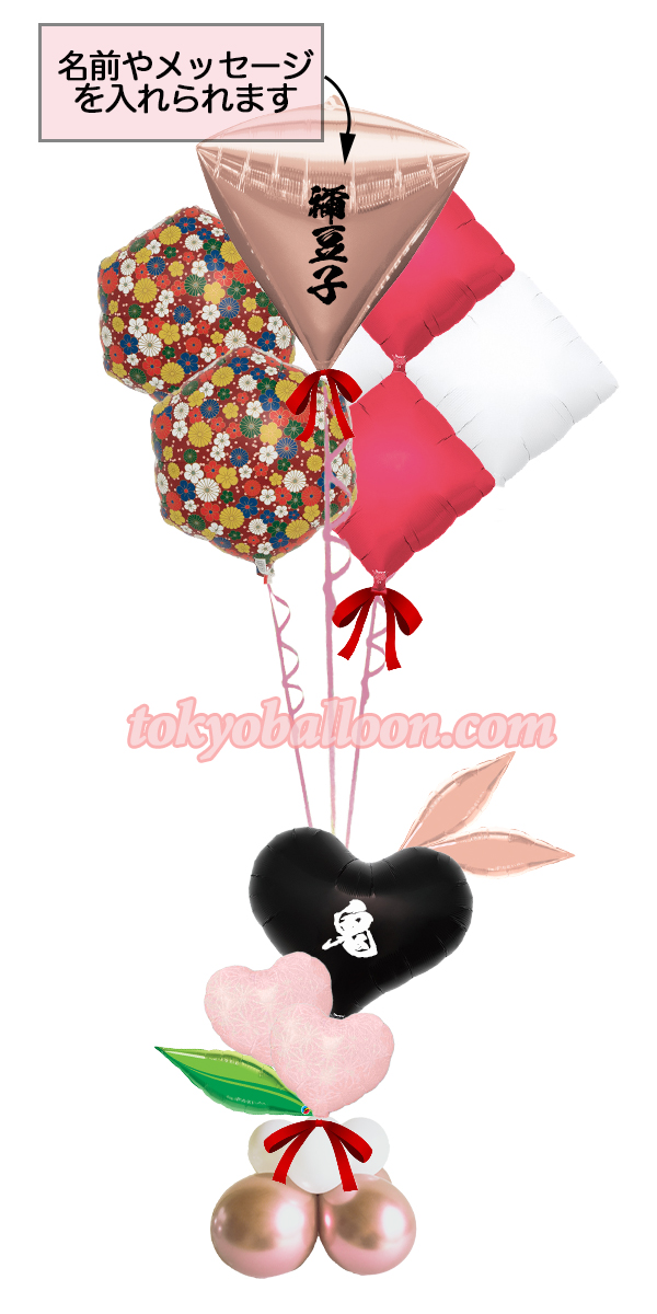 無料でダイヤ風船に名前もしくはメッセージを筆文字で入れる事ができます。メッセージ内容は決済時のコメント欄に入れてください。