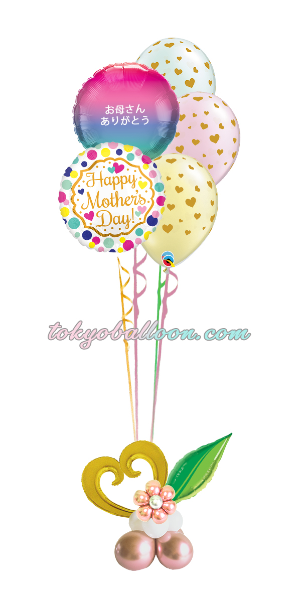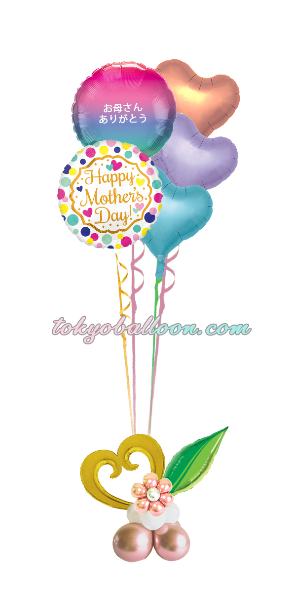 母の日用のヘリウム風船ギフト。Happy Mother’s Dayの風船とゴールドハートがお洒落。レインボー風船に無料でメッセージを入れる事ができます。ハートの風船のアレンジと花柄の風船のアレンジの2種類から選べます。